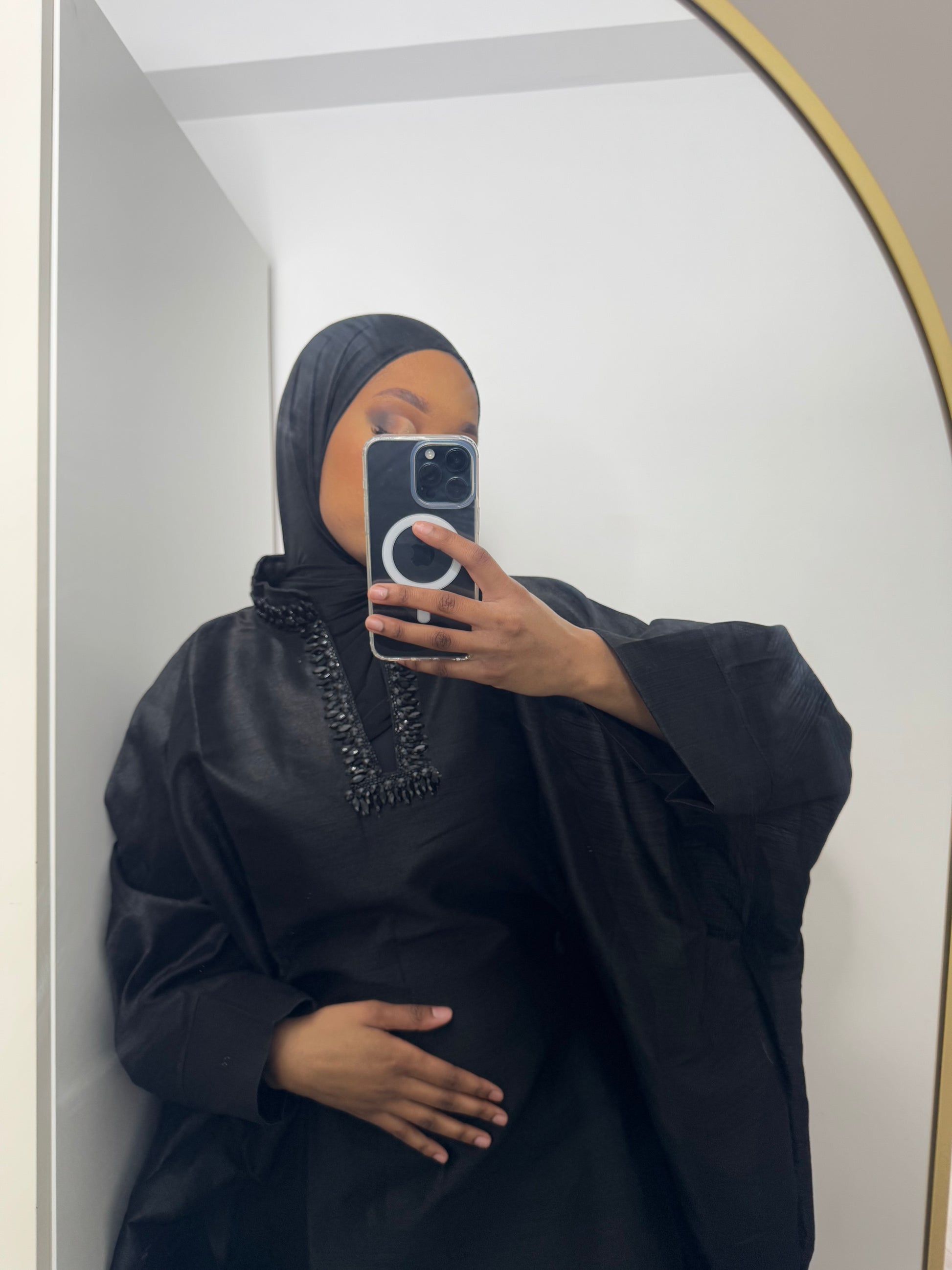 Bintou Dress, une élégante robe en chantoum avec un magnifique perlage au niveau du col. Elle convient jusqu’à 1,76 m et peut être cintrée à l’intérieur pour une coupe plus ajustée. Un foulard vient compléter l’ensemble pour une touche supplémentaire d’élégance.