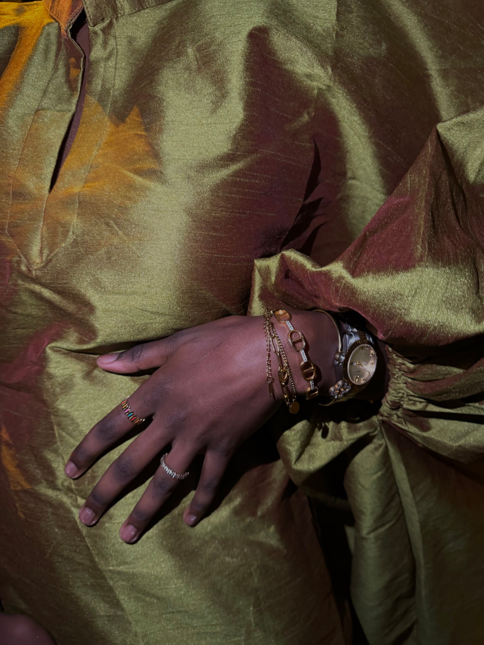 Robe en chantoum, longueur jusqu’à 1m80. Taille unique et ajustable à l’intérieur, avec foulard assorti pour une allure sophistiquée.